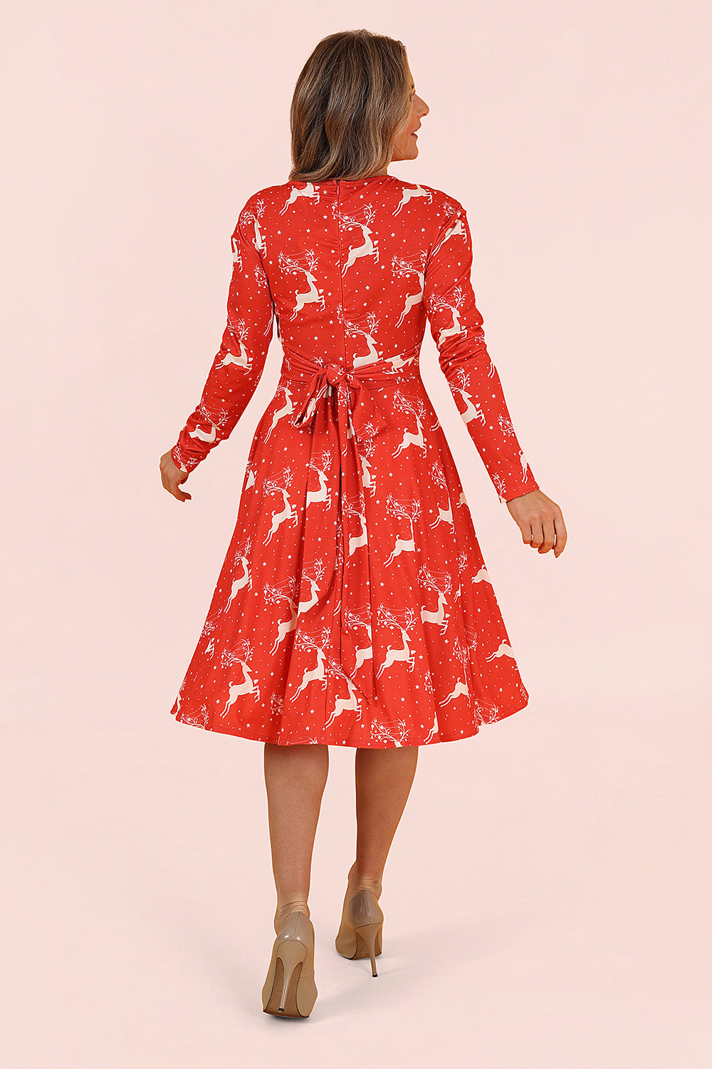 Looking forward to wearing this for Christmas gigs (such as Xmas Tree Festivals), I love the fun reindeer design and bright red colour. I had to order a larger size than normal (they were selling out fast) but with the waist ties I can pull it in. Looks good with a full petticoat underneath.